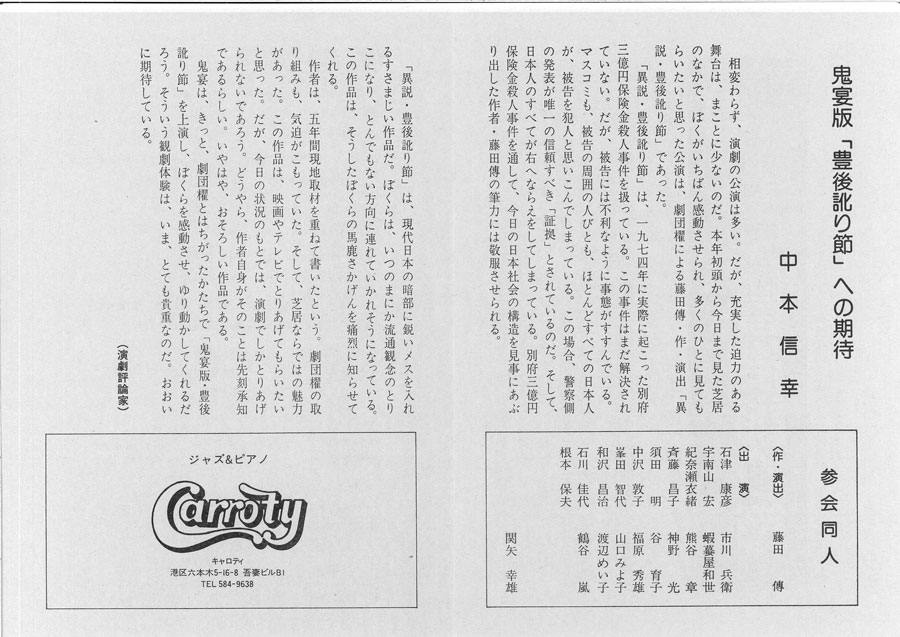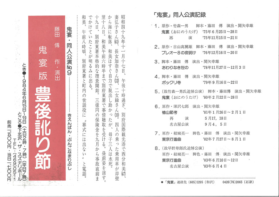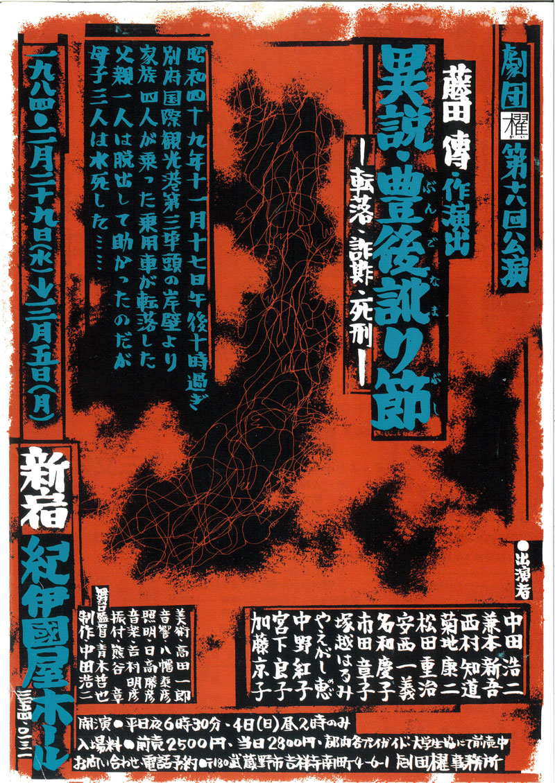 私は紀伊國屋ホールで行われたこの舞台を観ている。多分、藤田から誘われたものと思う。劇団櫂を観るのは初めてだった。冒頭、中央に置かれた大きな四角いデスクの上に爪先立ちになって、周囲から突き出されるマスコミの多数のマイクや記者の手帳にたじろぐ西分(松田重治)の姿が強く印象に残る。しかし、この作には先行する舞台があった。俳優の丹波哲郎が俳優養成機関として開塾した「丹波道場」の研修生に向けた『異説 豊後浄瑠璃』がそれだ。前年9月の公演なので、『異説 豊後訛り節』のパイロット版なのではないか、と、後にハチマル版『豊後訛り節』(2023年)の演出を手がける山本隆世は推測する。山本ですら観てはいないのだ。