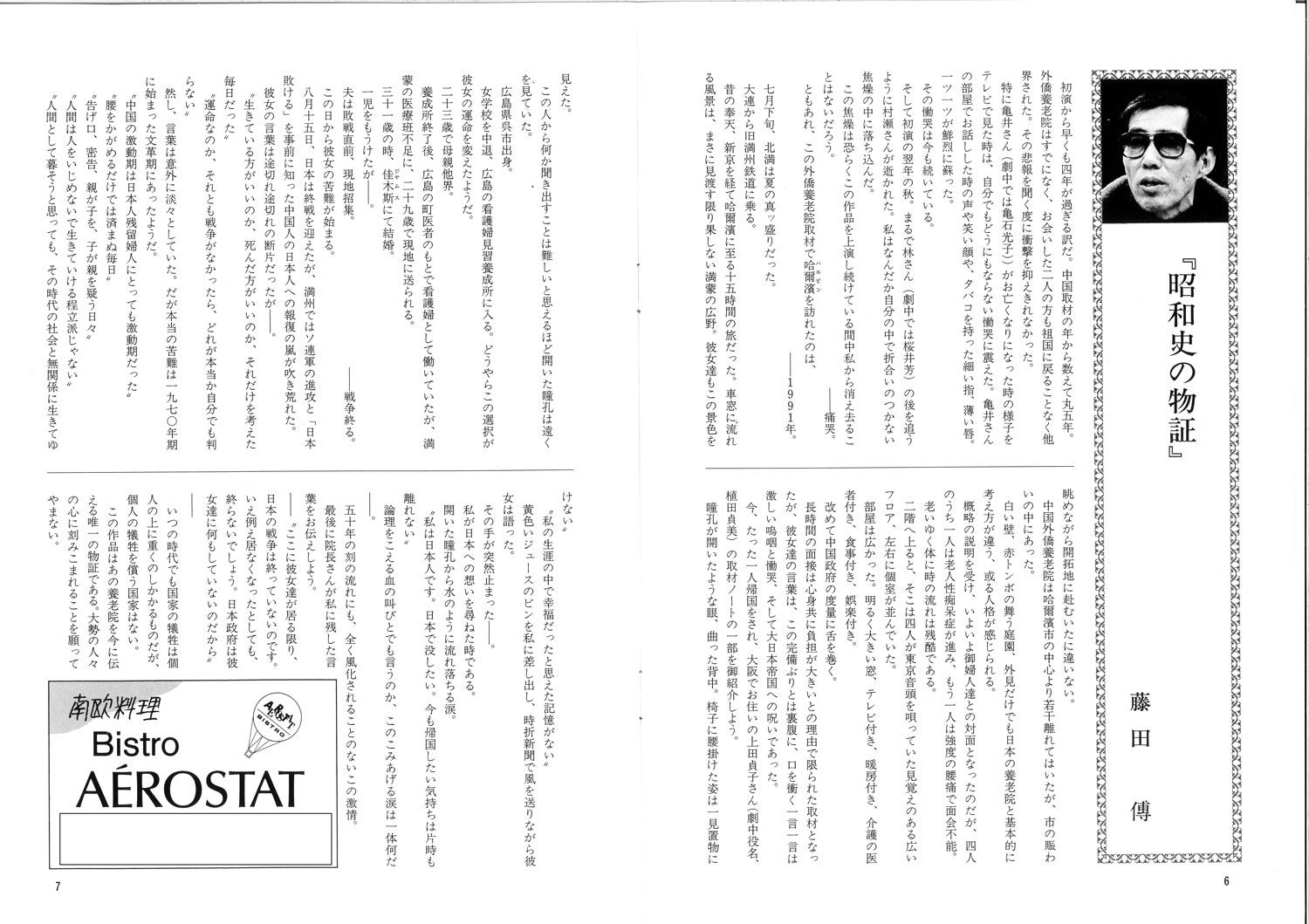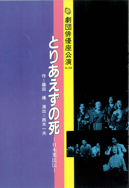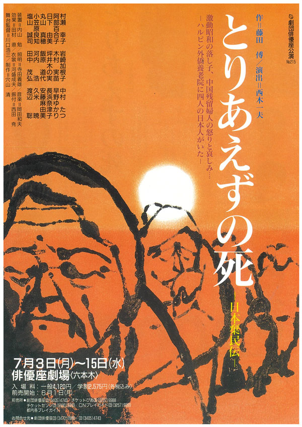 もう一つ、藤田をこの企画に駆り立てたのは、俳優座の女優陣だった。とくに最年長の村瀬幸子は築地小劇場の研究生から劇団築地小劇場、夫・北村喜八(劇作家)と共に創設した芸術小劇場など一貫して新劇畑を歩み、1944年設立の劇団俳優座の千田是也、東山千栄子、小沢栄太郎などと並ぶ劇団結成メンバーの一人になった。さらに俳優座2期生の岩崎加根子(現・劇団俳優座代表)と中村たつ、3期下の阿部百合子らの大ベテランが「中国国営哈爾浜外僑養老院」に起居する4人の残留婦人を演じるということが、日頃、息子、娘、孫のような若い世代の俳優を相手に芝居を創っている藤田にとってどれだけモチベーションを掻き立てられたことだろう。晩年に吉田喜重監督『人間の約束』(86年)や黒澤明監督『八月の狂詩曲』(91年)の映画で主演を勤め、全国的な知名度を持つ村瀬は、初演の前橋公演の後に88歳で急逝するが、その後を引き継いだ中村美代子の好演もあって、96年に再演を行うほどのヒット作となった。中村は劇団築地小劇場が解散させられた後、村瀬主宰の芸術小劇場に入り、その後、村瀬を追って俳優座に入団したキャリアを持つ。文字通り村瀬の衣鉢をついだのだ。