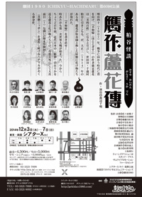 ■作品名 ー粕谷怪談ー 作・演出 ◎ 渡辺千明 明治40(1907)年、戦争に向かう時代に背を向け、『不如帰(ほととぎす)』の作者徳冨蘆花は「美的百姓」になると宣言し、世田谷・千歳村粕谷に引きこもる。が、大正3(1914)年のある夜、蘆花が恒春園と称した屋敷に化け物たちが現れた。 ■公演場所 東京両国 シアターX(カイ) シアターX(カイ)ホームページ ■公演日程 2014年(平成26年)12月3日(水)〜7日(日)