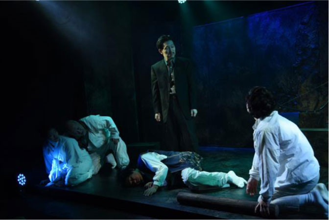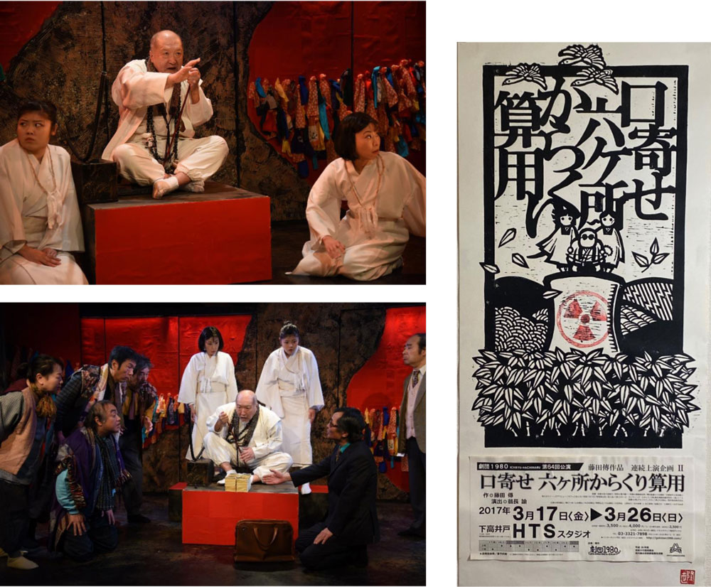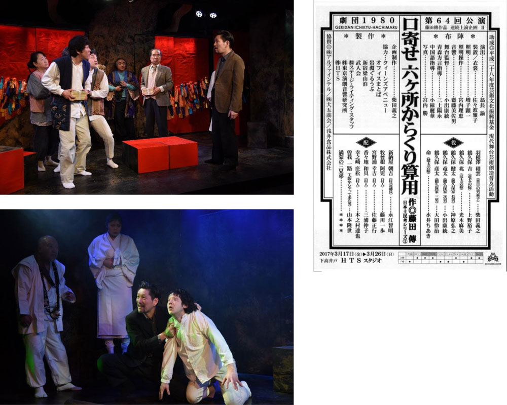 『口寄せ 六ケ所からくり算用』は藤田没後の2017年に、長く藤田の演出助手を務めた翁長諭演出によって再演された。藤田の演出を知る翁長が初演を踏襲するかたちで上演したが、当然ながら、キャストは一変する。積雲を演じた荒深は坊主頭に無精ひげ、汚れた袈裟を纏い、いかにも乞食坊主といった風体で、実によく役柄に似合った。惜しむらくは病を得て退団したことだ。劇団の中軸を担っていた女優、小川も東城ももういない。積雲の役は柴田義之が引き継ぎ、お吉、お兆には現劇団員の上野裕子、光木麻美が扮した。初演と同じだったのは大阪のブローカーに扮した山本隆世くらいだったろう。 このシリーズは全編、その土地の言葉、すなわち「方言」で演じられる。本作では、大阪弁をまくしたてる山本以外の登場人物は皆、津軽弁で芝居をする。初演時はそれが評判をとったが、再演に当たり、津軽弁の指導をしたのが「ぽこぽこクラブ」主宰の三上陽永だったことを今回、初めて知った。三上は青森県出身の俳優で、鴻上尚史の「虚構の劇団」に入り、その解散前後に作・演出者として自分の劇団を立ち上げる。ハチマルがそういう若い小劇場劇団とも交流を行っていることに一種の感慨を覚えた。時代が藤田の時代からひと巡りしたのだ。 なお、演出の翁長はこの後、2019年に急逝する。藤田を知る次世代演出家の死は惜しみても余りある。