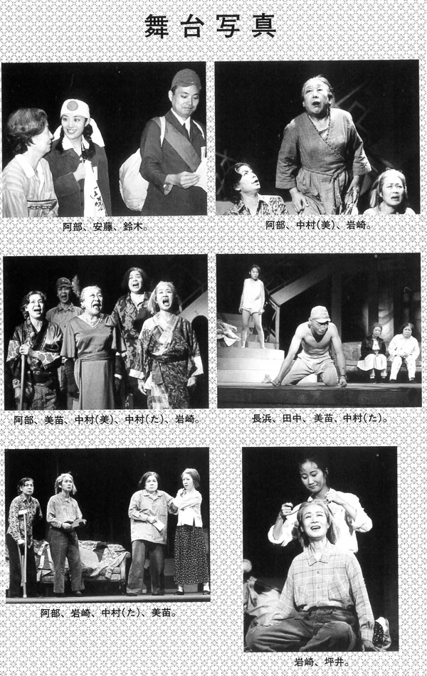 もう一つ、藤田をこの企画に駆り立てたのは、俳優座の女優陣だった。とくに最年長の村瀬幸子は築地小劇場の研究生から劇団築地小劇場、夫・北村喜八(劇作家)と共に創設した芸術小劇場など一貫して新劇畑を歩み、1944年設立の劇団俳優座の千田是也、東山千栄子、小沢栄太郎などと並ぶ劇団結成メンバーの一人になった。さらに俳優座2期生の岩崎加根子(現・劇団俳優座代表)と中村たつ、3期下の阿部百合子らの大ベテランが「中国国営哈爾浜外僑養老院」に起居する4人の残留婦人を演じるということが、日頃、息子、娘、孫のような若い世代の俳優を相手に芝居を創っている藤田にとってどれだけモチベーションを掻き立てられたことだろう。晩年に吉田喜重監督『人間の約束』(86年)や黒澤明監督『八月の狂詩曲』(91年)の映画で主演を勤め、全国的な知名度を持つ村瀬は、初演の前橋公演の後に88歳で急逝するが、その後を引き継いだ中村美代子の好演もあって、96年に再演を行うほどのヒット作となった。中村は劇団築地小劇場が解散させられた後、村瀬主宰の芸術小劇場に入り、その後、村瀬を追って俳優座に入団したキャリアを持つ。文字通り村瀬の衣鉢をついだのだ。